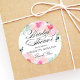 De här elegant bröllop-möhippans favoritklistermärken har en underbar blommigt ram av blommor av vattenfärgad daisy i mjuka nyanser av rosa, , akvarier och grönt. Klassisk svartvit personlig för namn i bruden med ett Tack för anpassningsbar. Perfekt för en händelse i vår eller sommarens möhippa.