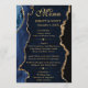 A striking design featuring deep navy blue agate textures accented with shimmering gold glitter for a glamorous, modern finish. Elegant flowing script pairs with bold serif typography to create a refined, high‑end aesthetic. The rich blue tones evoke sophistication and timeless elegance, while metallic gold accents add warmth and sparkle. Perfect for weddings with gemstone or geode themes, this chic menu card brings a polished, editorial look to your table setting—ideal for romantic celebrations and stylish evening receptions.