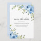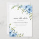 Moderna blåfärgblommor och grönt dekorerar den här blommigten av eleganten sparar datuminbjudan. Använda onlinen mall verktyg om du vill ändra teckensnittet stil, färg och bakgrund till valfritt alternativ.