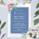 Personligens bröllopsinbjudningar med accenter för söt rosa blommigt och blått center med vitt teckensnitt. Tema elegant blommigt bröllop.