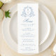 Öka mottagningen med den här mjuka blåblå bröllop-menyns lugnande charm. En delikat blå botanisk vapensköld omger parets monogram överst, allt mot en vit bakgrund. "Menu" visas i elegant med mjuk blått calligrafi, med utrymme för att anpassa parets menyalternativ namn, bröllop och anpassningsbar. Perfekt för romantiska, kustnära eller elegant bröllop teman. Den här designen ger dig ett gott, förfinat intryck på firande.