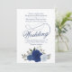 Den här vackra bröllopsinbjudan har en vacker hand målad vattenfärgad bukett av ro, blommor, eukalyptus löv och grön i skuggor av dammig blå, marin och indigo. Utformningen har ett kalligrafiskt skript i finare med ett långt kort svan skapar det både modernt och klassiskt. Elegant, sofistikerad och chic till inbjudan för dina vänner och din familj till på din speciella dag. Kortets baksida är ett marmorerat stålblått färg med en QR-kod och ett utrymme för att rikta gästerna till webbplatsen för mer information och OSA.