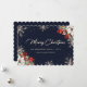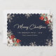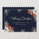 Elegant dark blue Christmas card featuring sparkling snowflakes and a watercolor painting of white poinsettia, conifer tree branches, holly and red berries.