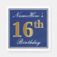 Den här enkla och elegant pappra napkin-designen innehåller ett meddelande som "Namehär's 16 Birthday" (med "16:e" som har en ytliknande guld-färg) i ett fyrkantigt område med blå färgad med en enkel gräns-kontur. Namn är i manusliknande text med vit färgad och kan vara personlig. Napkins som dessa kan kanske användas i en födelsedagsfest till någon som firar sin sextonde födelsedag. [~Z0000141]