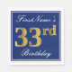 Den här enkla och elegant pappra napkin-designen innehåller ett meddelande som "FirstName's 33rd Birthday" (med "33rd" som har en faux-guld-liknande färg) i ett fyrkantigt område med blå färgad med en enkel gräns-kontur. Namn är i manusliknande text med vit färgad och kan vara personlig. Napkins som dessa kan kanske användas i en födelsedagsfest till någon som firar sin trettiotredje födelsedag. [~Z0000141]