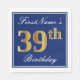 Den här enkla och elegant pappra napkin-designen innehåller ett meddelande som "FirstName's 39 Birthday" (med "39:e" som har en ytliknande guld-färg) i ett fyrkantigt område med blå färgad med en enkel gräns-kontur. Namn är i manusliknande text med vit färgad och kan vara personlig. Napkins som dessa skulle kanske kunna användas i en födelsedagsfest till någon som firar sin trettionionde födelsedag. [~Z0000141]