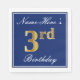 Den här enkla och elegant pappra napkin-designen innehåller ett meddelande som "Namn-här's 3rd Birthday" (med "3rd" som har en fingerad guld-liknande färgning) i ett fyrkantigt område med blå färgad med en enkel gräns-kontur. Namn är i skriptliknande text med vit färgad och kan anpassas. Napkins som dessa kan kanske användas i en födelsedagsfest till någon som firar sin tredje födelsedag. [~Z0000141]