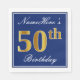 Den här enkla och elegant pappra napkin-designen innehåller ett meddelande som "Namehär's 50 Birthday" (med "50:e" som har en ytliknande guld-färg) i ett fyrkantigt område med blå färgad med en enkel gräns-kontur. Namn är i skriptliknande text med vit färgad och kan anpassas. Napkins som dessa kan kanske användas i en födelsedagsfest till någon som firar sin femtioårsdag. [~Z0000141]