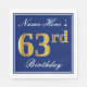Den här enkla och elegant pappra napkin-designen innehåller ett meddelande som "Namn-här's 63:e födelsedag" (med "63:e" färgen "faux guld-like") i ett fyrkantigt område med blå färgad med en enkel gräns-kontur. Namn är i skriptliknande text med vit färgad och kan anpassas. Napor som dessa kan kanske användas i en födelsedagsfest till någon som firar sin sextiotredje födelsedag. [~Z0000141]