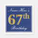 Den här enkla och elegant pappra napkin-designen innehåller ett meddelande som Namn-här:s 67:e födelsedag (där "67:e" har en fingerad guld-liknande färg) i ett fyrkantigt område med blå färgad med en enkel gräns-kontur. Namn är i skriptliknande text med vit färgad och kan anpassas. Napkins som dessa kan kanske användas i en födelsedagsfest till någon som firar sin sextiosjunde födelsedag. [~Z0000141]