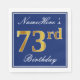 Den här enkla och elegant pappra napkin-designen innehåller ett meddelande som "Namehär's 73 Birthday" (med "73:e" som har en faux-guld-liknande färg) i ett fyrkantigt område med blå färgad med en enkel gräns-kontur. Namn är i skriptliknande text med vit färgad och kan anpassas. Napkins som dessa kan kanske användas i en födelsedagsfest till någon som firar sin sjuttiotredje födelsedag. [~Z0000141]