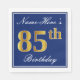 Den här enkla och elegant pappra napkin-designen innehåller ett meddelande som "Namn-här's 85:e födelsedag" (med "85:e" som har en ytliknande guld-färg) i ett fyrkantigt område med blå färgad med en enkel gräns-kontur. Namn är i skriptliknande text med vit färgad och kan anpassas. Napkins som dessa skulle kanske kunna användas i en födelsedagsfest till någon som firar sin åttiofemårsdag. [~Z0000141]
