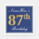 Den här enkla och elegant pappra napkin-designen innehåller ett meddelande som "Namehär's 87:e födelsedagen" (med "87:e" som har en faux-guld-liknande färg) i ett fyrkantigt område med blå färgad med en enkel gräns-kontur. Namn är i manusliknande text med vit färgad och kan vara personlig. Napkins som dessa kan kanske användas i en födelsedagsfest till någon som firar sin åttio sjunde födelsedag. [~Z0000141]