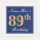 Den här enkla och elegant pappra napkin-designen innehåller ett meddelande som "Namn-här's 89:e födelsedag" (med "89:e" som har en ytliknande guld-färg) i ett fyrkantigt område med blå färgad med en enkel gräns-kontur. Namn är i manusliknande text med vit färgad och kan vara personlig. Napkins som dessa kan kanske användas i en födelsedagsfest till någon som firar sin åttionionde födelsedag. [~Z0000141]