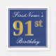 Den här enkla och elegant pappra napkin-designen innehåller ett meddelande som "FirstName's 91st Birthday" (med "91st" som har en faux-guld-liknande färg) i ett fyrkantigt område med blå färgad med en enkel gräns-kontur. Namn är i manusliknande text med vit färgad och kan vara personlig. Napkins som dessa skulle kanske kunna användas i en födelsedagsfest till någon som firar sin nittioårsdag. [~Z0000141]