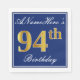 Den här enkla och elegant pappra napkin-designen innehåller ett meddelande som "ANamehär's 94:e födelsedag" (med "94:e" som har en ytliknande guld-färg) i ett fyrkantigt område med blå färgad med en enkel gräns-kontur. Namn är i manusliknande text med vit färgad och kan vara personlig. Napkins som dessa skulle kanske kunna användas i en födelsedagsfest till någon som firar sin nittiofjärde födelsedag. [~Z0000141]