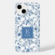 Elegant Blue French Toile Pattern with Monogram and Name - A beautiful, elegant blue and white floral toile de jouy pattern showcasing your customizable monogram initial and name underneath in white serif text on a classic blue background with white border. An ever popular aesthetic, this vintage french country pattern and monogram design is the perfect combination to reflect your personal, classy and timeless style.