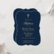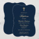 Elegant blue och guld baptism-inbjudningar som innehåller ett guld kor och ett elegant-skript.