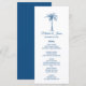 Ge gästerna den här tropiska bröllop-menydesignen med modernt skript, blå text och ett konstnärligt handflatan träd. En samordnande blå bakgrund är på baksidan. Kontakta mig om du behöver hjälp eller anpassningsbar.