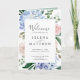 Detta elegant blåblåaktigt, vitt, uppfällt bröllopsprogram är perfekt för vår eller sommar bröllop. Den klassiska blommigten är utformad med mjuka pulverblåa vattenfärgsvätskor som accentueras med neutraltens blommor och grönt löv.