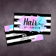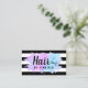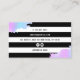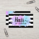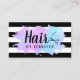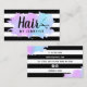 Modern affärskort med svart och vitt rand, övertoningsblått och lila struktur, saxar och elegantens kalligrafteckensnitt.