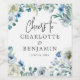 Skämt vita blommor och grönt vattenfärg löv bildar ett vackert gräns på den söt blå blommigten vår bröllop vin. Ett chic, modernt handskript med elegant grått-skript för ditt trädgårdsbröllop.
