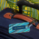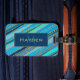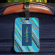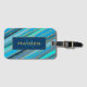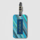 Elegant och snyggt personlig bagagetagg med rand i olika blå skuggor och dekorerat med guld punkter.