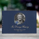 Elegant personlig blå blommigt begravningsfotogäst bok med blått ro som lägger ett guld-foto ram mot blå bakgrund.
