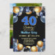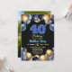 An elegant modern design featuring blue 40 number with gold edges and balloons with silver, blue and gold glitter and a special photo of the birthday person on the back of the invitation. Customize the details for a unique and chic Birthday Celebration.