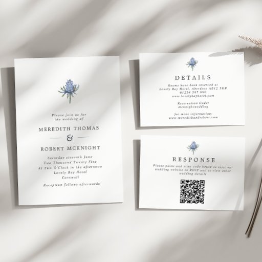 Elegant Blue Watercolor Thistle Bröllop Menu perfekt för ett skotskt bröllop. "meny" finns i det moderna kalligrafteckensnittet. Anpassa med datum och meny för namn och bröllop.