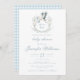 Upplev en tidlös sofistikering med den här vintage-temade duschinbjudan till pojke, som innehåller en charmerande stork som transporterar pojke i en söt vapensköld och baby blue gingham mönster i baksidan. Perfekt för elegant klassisk pojke firande.