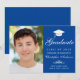 Skicka ett unikt studenten-kort för personlig till familjen och dina vänner med anpassningsbarnas foto till den lämnat och till högerna en vit gradens sockel med ord Student, klass/år, namn och andra ceremonidetaljer i kalligrafi för skript för att anpassa sig till royalets blå bakgrund. Designad av ©Susan Coffey.