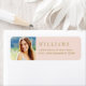 Enkel och elegant anpassad adressetikett design med senior foto av examen med antikk guld returadress text och rosafärgad bakgrund. Färgerna kan anpassas.