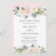 Detta eleganta bröllopskort för att spara datum har en vacker akvarell i blush och vit blomsterarrangemang. Designad för att matcha vår Romantiska blommor bröllopssamling. Anpassa det enkelt och snabbt med dina detaljer genom att trycka på knappen för att anpassa och omarrangera och formatera stil och placering av texten. (c) The Happy Cat Studio