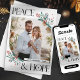 Julkortet i elegant har en romantisk bild av ett par mot en vacker, boho-inspirerad bakgrund. Utformningen är ren och modern med en gnutta fräckhet. "Peace & Hope"-hälsning är skrivet i ett fet, elegant typsnitt, som skapar ett sofistikerat utseende. Fotot är framtaget av en unik, vismisk båge med vattenfärgad blommigt inslag och röda bär. Den övergripande utformningen är både tidlös och festlig, skapar perfekten för par att fira julhelgen.