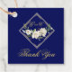 Elegant bröllop föredrar taggar för tack för att du ger med antika vita vattenfärgblommor med bär mot en rik blå bakgrund med guld-trim. Anpassa med ditt monogram initialer.