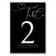 Elegant Bordsnummer Modern Script Black Bröllop. Fantastisk design med parets namn och bröllop-datum med ett dekorativt "bord"-skript med kärlek hjärtaccent. Vit text på svart. Anpassa med information om bordsnummer och bröllop. Typsnitt, text, färg är anpassade. Vi inbjudan besöker vår Zazzle-butik, Austen & Grace, för att se fullt-svit, matcha produkter med mera. Kontakta oss om du behöver hjälp.
