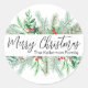 This simple and classic round Christmas sticker features elegant greenery, including evergreen branches, leaves, and subtle pops of red holly berries for a festive touch. In the center, “Merry Christmas” is written in graceful script typography, with space below for your family name or business name.