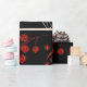 Elegant botanical pattern on black background featuring white leaves, red berries, and intricate floral designs in gold accents, creating a festive, decorative feel.