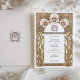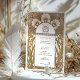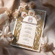 Fira bröllop med den här Art nouveau-inspirerade inbjudan. Denna utformning har invecklade blommönster, inklusive elegant- och svepande gyllene blad, och den förkroppsligar tidlös sofistikering. Den här inbjudan är perfekt för vintage, romantiskt eller konstnärligt temat bröllop och fungerar med mjuka pastelltoner av blått, rosa och guld. Den omvända sidan visar en matchande vapensköld för blommigt som fyller det lyxiga utseendet. Ett vackert val för dem som uppskattar klassisk konst och detaljrikedom.