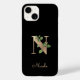 Svart telefonväska i elegant har ett botaniskt monogram i guld i mitten.