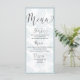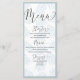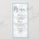 Den här vackra vattenfärgsdesignen i eleganten kommer att passa väl. Den har en enkel dammig blå botanisk motiv som upprepas över hela mallen. Med handskrivet skript i stil är det enkelt att anpassa det här unika menykortet.