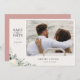 Elegant vattenfärg botaniskt blad och vit blommigt arrangemang, spara datumfotokortet. Funktioner, neutralt kräm och dammiga bakgrunder i ro färg med kalligrafi "accent grafik".