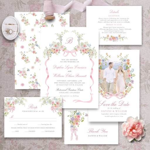 This RSVP card features a delicate watercolor floral arrangement accented with a soft pink bow, designed in a refined Victorian garden style. Pastel blooms in blush, dusty rose, pale blue, butter yellow, and lavender are paired with fresh greenery for an airy, romantic look. A clean QR code layout keeps the design elegant while blending seamlessly with the floral stationery suite.