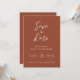 Vår elegant har bränt orange bröllop spara datum-design och är perfekt för ett annonskort för ditt minimalistiska fall-bröllop firande. Ett vackert par med vitt kalligrafteckensnitt med enkel och ren text på en brinnande bakgrund för orangen ger ett förhöjt utseende som kompletterar snyggten. Enkel och snabb att anpassa dig med din egen händelseinformation för namn och bröllop.