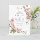 Eleganta blommiga bröllopskort med era namn och bröllopsdetaljer omgivna av en oval ram med akvarellrosor i nyanser av rosaton och dammig ros med frodig grön lövverk. De romantiska rosbröllopskorten är perfekta för vår- och sommarträdgårdsbröllop!