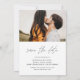 Bröllop Spara Datum-kort som har ett foto på framsidan och baksidan. Spara Datum-korten innehåller en modern handskriven kursiv typsnitts typografi som är elegant, enkel och modern att använda efter din minimalistiska enkla bröllopsdag firande.
