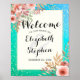 Bröllops Hälsning Mottagning Skylt Affisch Mallar - Elegant Bokstavsstil Skript och Vintage Vattenfärg Rosa Blommor på Turkos Teal Blå Grön och Falskt Guld Folie Konfetti Prickig Bakgrund.