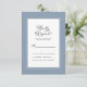 Detaljkortet för Dusty Blue bröllops-RSVP har en vacker, chic ram i dammig blå som inkluderar en elegant, liten vit ram. Kalligrafi och typsnitt är kolgråa på vit bakgrund. En modern mall för datum och år kompletterar den unika kalligrafidesignen.