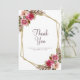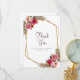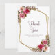 Elegant, chic och formell Bröllop Tackar-funktion med romantisk bröllopsvattenfärgblomsterarrangemang i nyanser av magenta, rosafärg, rosa och lila som visas i lummig grönska på en tidlös, krispig vit bakgrund. En gnistrande metallisk gyllene geometrisk kristallformad ram ger en trendig touch. Traditionell, klassisk formulering ger tidlös sofistikation. Anpassa bröllopsdesignen med dina detaljer i elegant lila bokstav och handskrift. Baksidan av kortet är en solid, krispig vit.